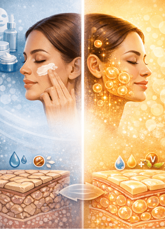 Usted puede aplicar las mejores cremas del mundo y aun así sentir su piel apagada o fatigada. La razón es simple: la deshidratación y la carencia de micronutrientes no se corrigen solo con tópicos.